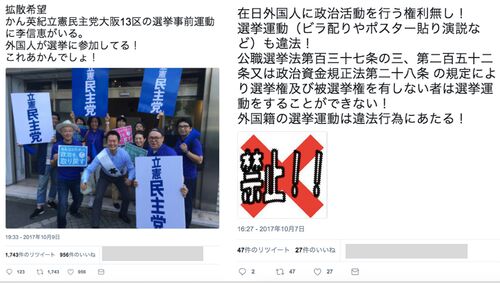 衆院選挙に関して、「外国人が選挙に参加してる!これあかんでしょ!」「外国籍の選挙運動は違法行為にあたる!」などの書き込みがツイッターに投稿されています。フェイクニュース確認プロジェクトの参加者は、 公職選挙法などに外国人の選挙運動を制限する…