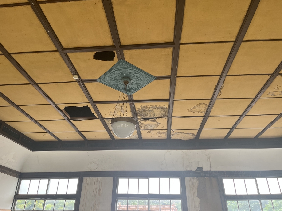 島根県内から建築や町並みに造詣が深い方々がわざわざ足を運んでくださり、この建物の面白ポイントや見どころなどなどを解説していただきました。皆さん着目しておられたのが二階の天井と照明。建設当時ならではの意匠や作り方とのことでした。天井には穴が空いたり染みで汚れていたりするところも目立ち、修繕をしっかりしていく必要があります。
